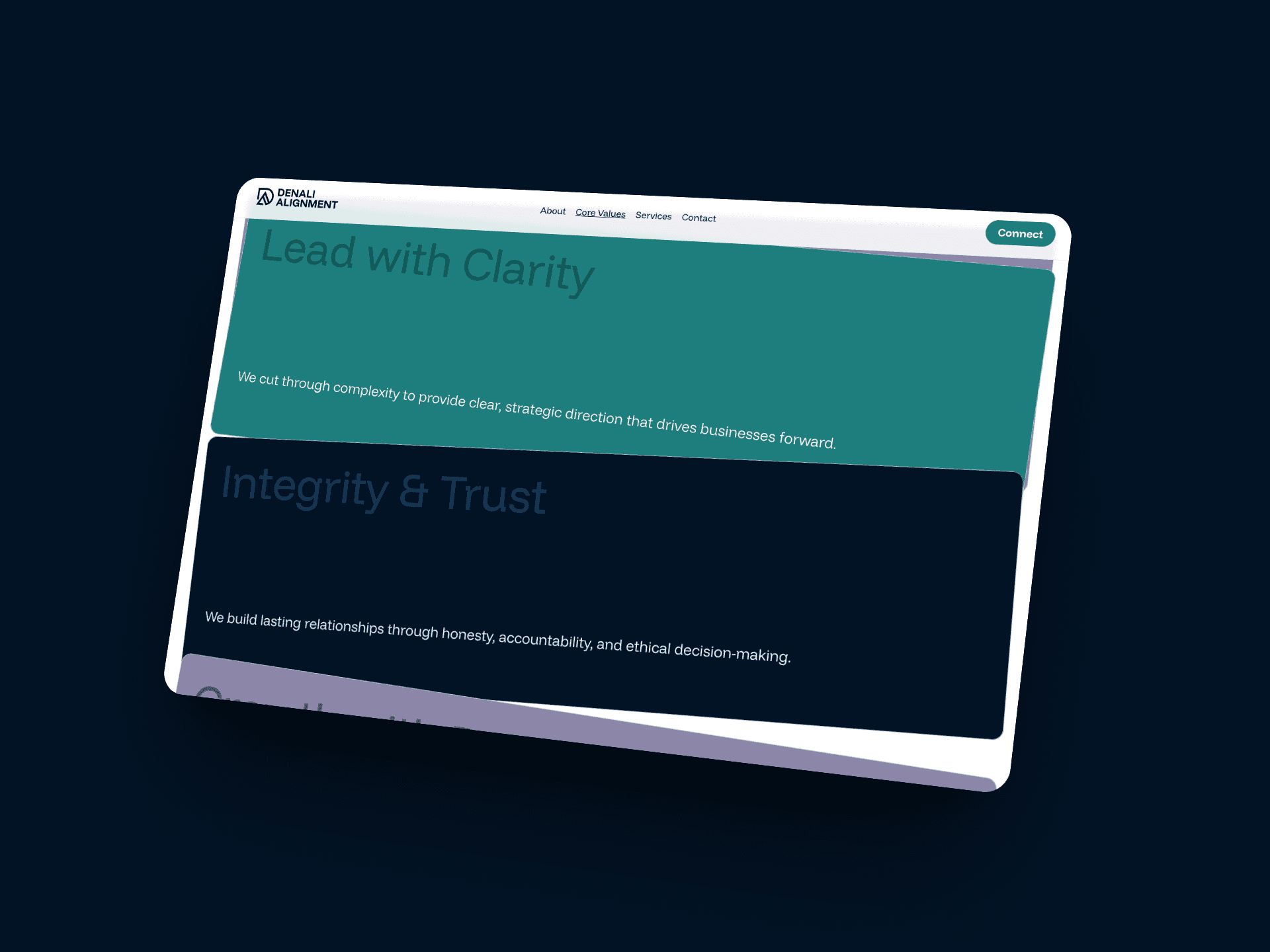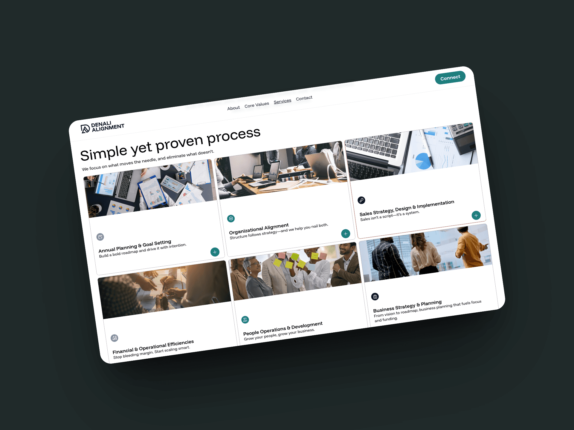 Denali Alignment came to us with years of experience — but no digital footprint. They’d spent years helping businesses scale with confidence, aligning vision, strategy, and execution at the highest level. But without a website, their brand was invisible online. We changed that. We designed and built a site that feels as sharp and strategic as their services. Storytelling became the centerpiece — turning complex offerings into a clear, compelling narrative that resonates with ambitious business leaders. At the same time, we focused on functionality: lead generation forms, a future-ready store for classes and workshops, and a scalable foundation for webinars and resources to come. The result? A modern, intuitive platform that positions Denali Alignment not just as consultants but as the operational partners every scaling business needs. Because the truth is: people don’t just hire strategy. They hire the confidence to grow.